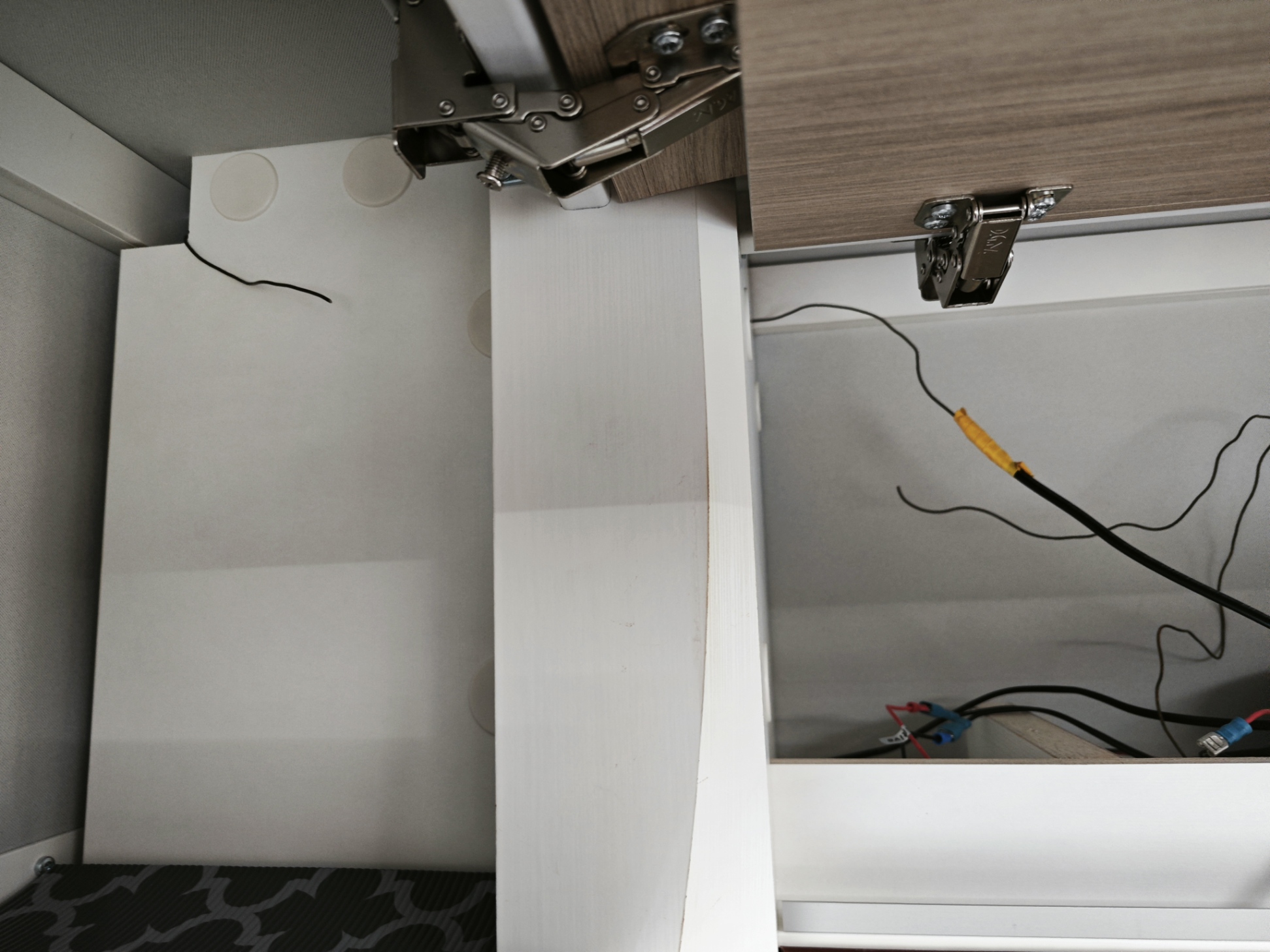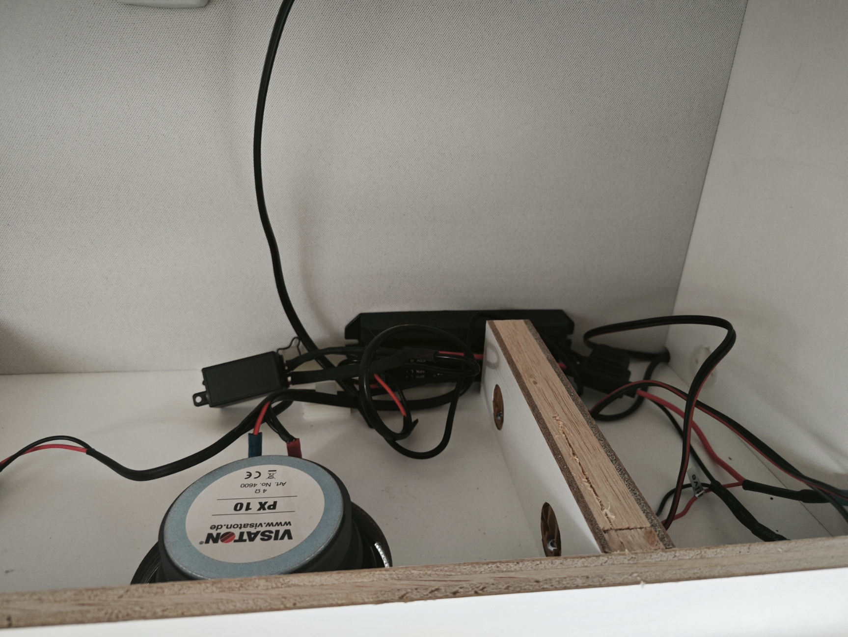 Zwischen den Oberschränken verläuft ein Kabelkanal – perfekt für ein neues Lautsprecherkabel.