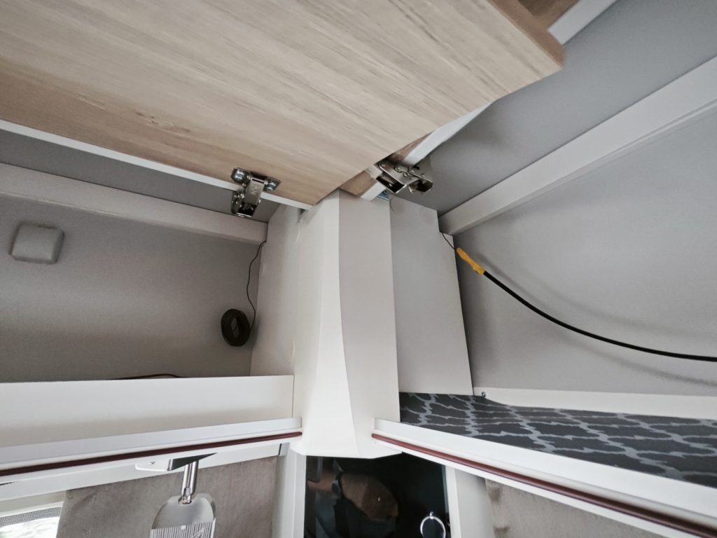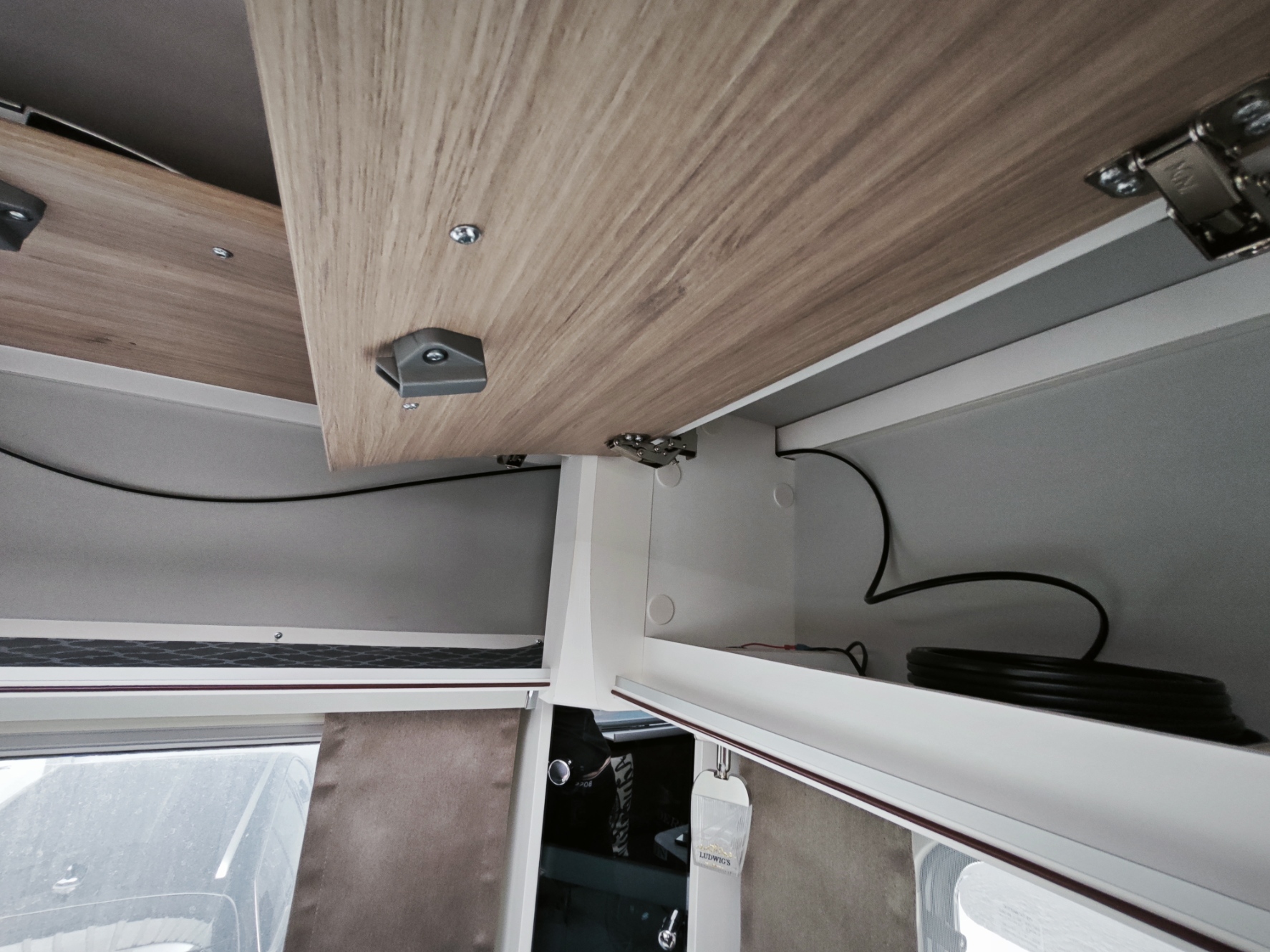 Über den beiden Lautsprechern hinten im Wohnmobil hängen zwei Oberschränke.